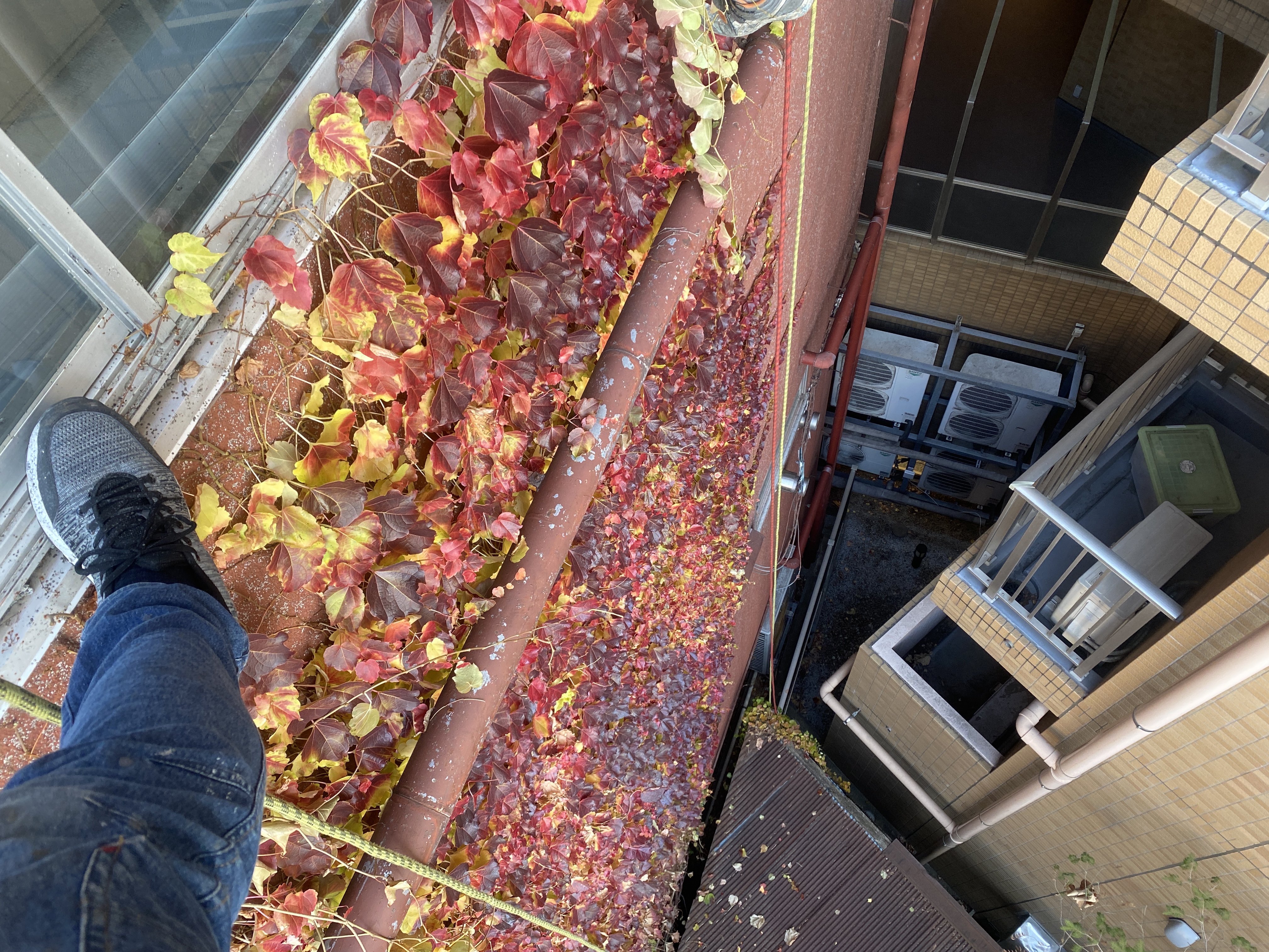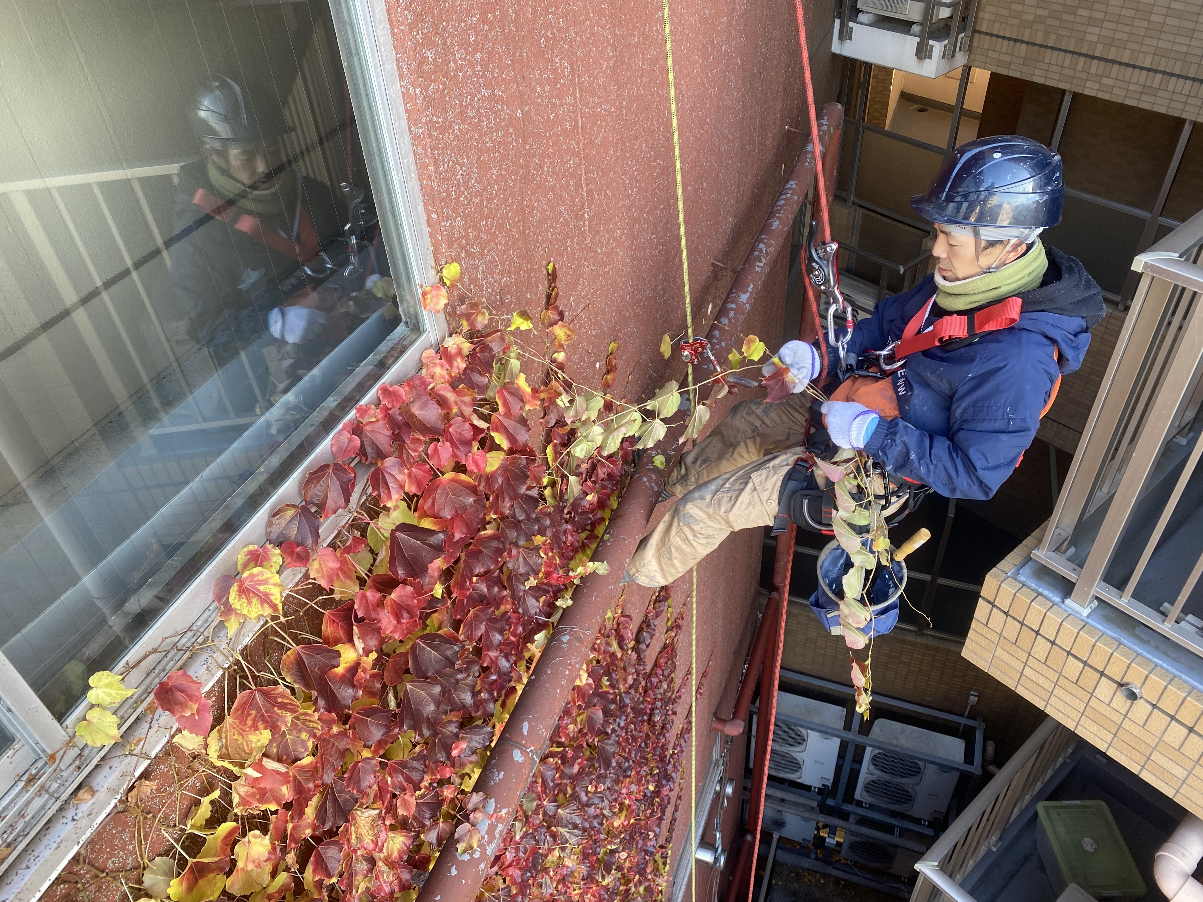 今日は!ブランコ(高所ロープ)作業で外壁のツタ撤去作業の様子をお送りします。